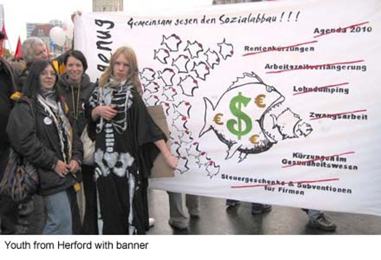 In the event, 300 buses came from across Germany, bringing people to the biggest demonstration in Berlin since the massive anti-war mobilisation in the spring of this year. Large numbers of senior citizens marched alongside tens of thousands of young people and entire families to express their anger and disgust at government plans for the dismantling of social provisions and guarantees that had their origins in the “carrot-and-stick” policies of German chancellor Bismarck 130 years ago.