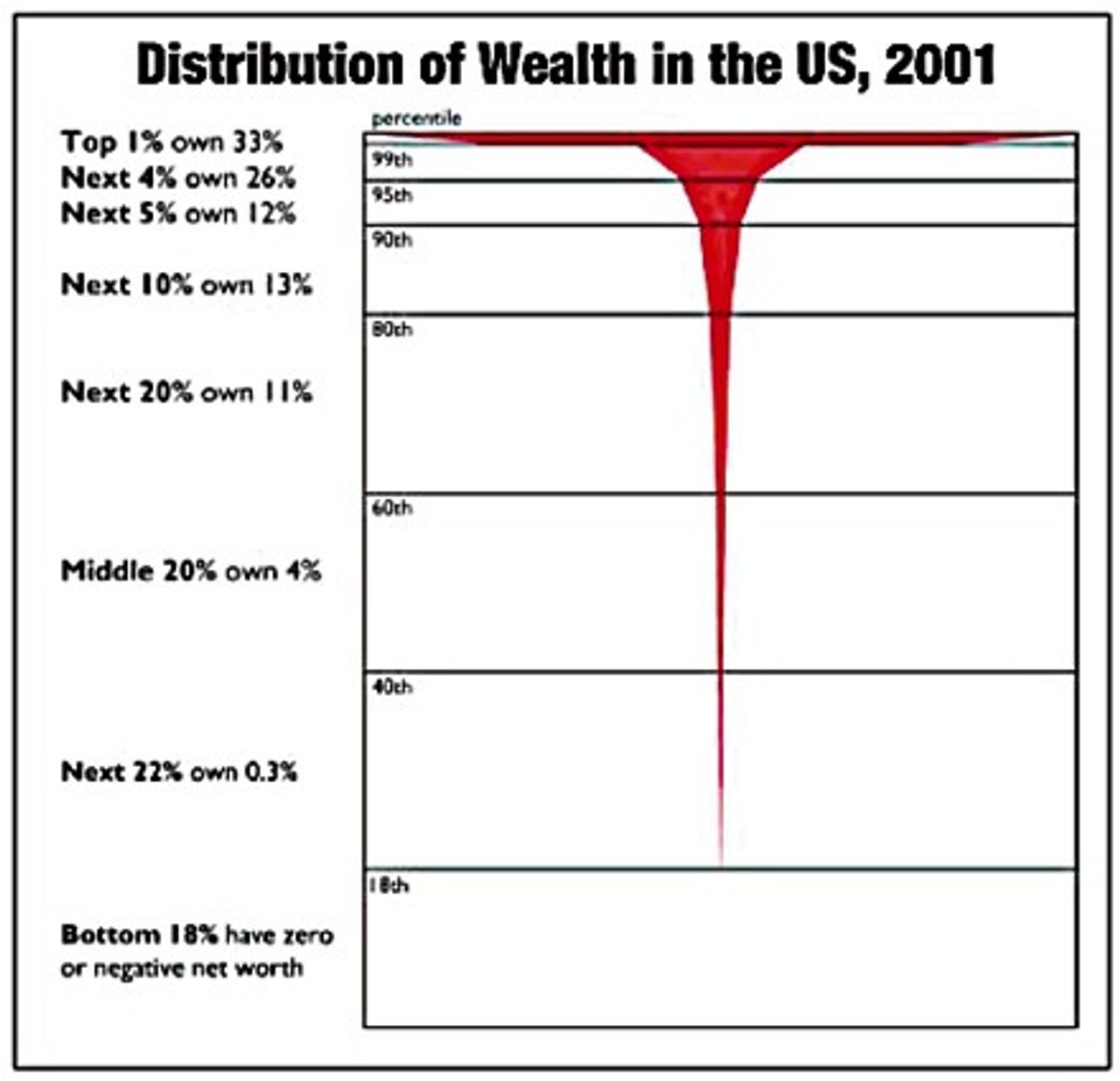 Chart 5 shows the distribution of wealth in the United States in the year 2001. The richest 1 percent of the population controls 33 percent of the national wealth. The next 4 percent own 26 percent. The next 5 percent owns 12 percent. Collectively, the richest 10 percent owns 71 percent of the national wealth. The 10 percent below them owns 13 percent. The next 20 percent owns 11 percent. The middle 20 percent owns just 4 percent. The next 22 percent owns 0.3 percent. The bottom 18 percent has zero or negative net worth.