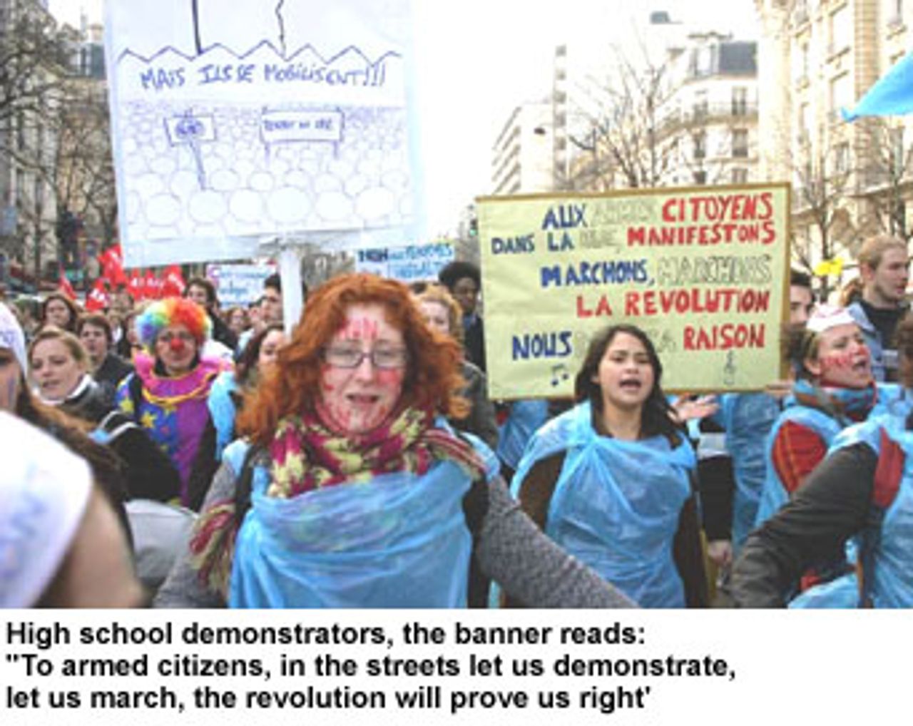 Only a small section of the demonstration, however, featured flags and banners of the old bureaucratic organisations of the French working class. Most people came independently and many carried their own placards: “No to throw-away youths,” “Tired of being squeezed lemons,” “No to the Kleenex contract,” “Slave labour by the back door,” “Throw away the job contract, don’t throw away the youth!” One sign showed a guillotine slicing through the popular slogan of the 1789 French Revolution: Liberté, Fraternité, Egalité. The most popular banner declared, “Contract for slaves” (Contrat Pour Esclaves).