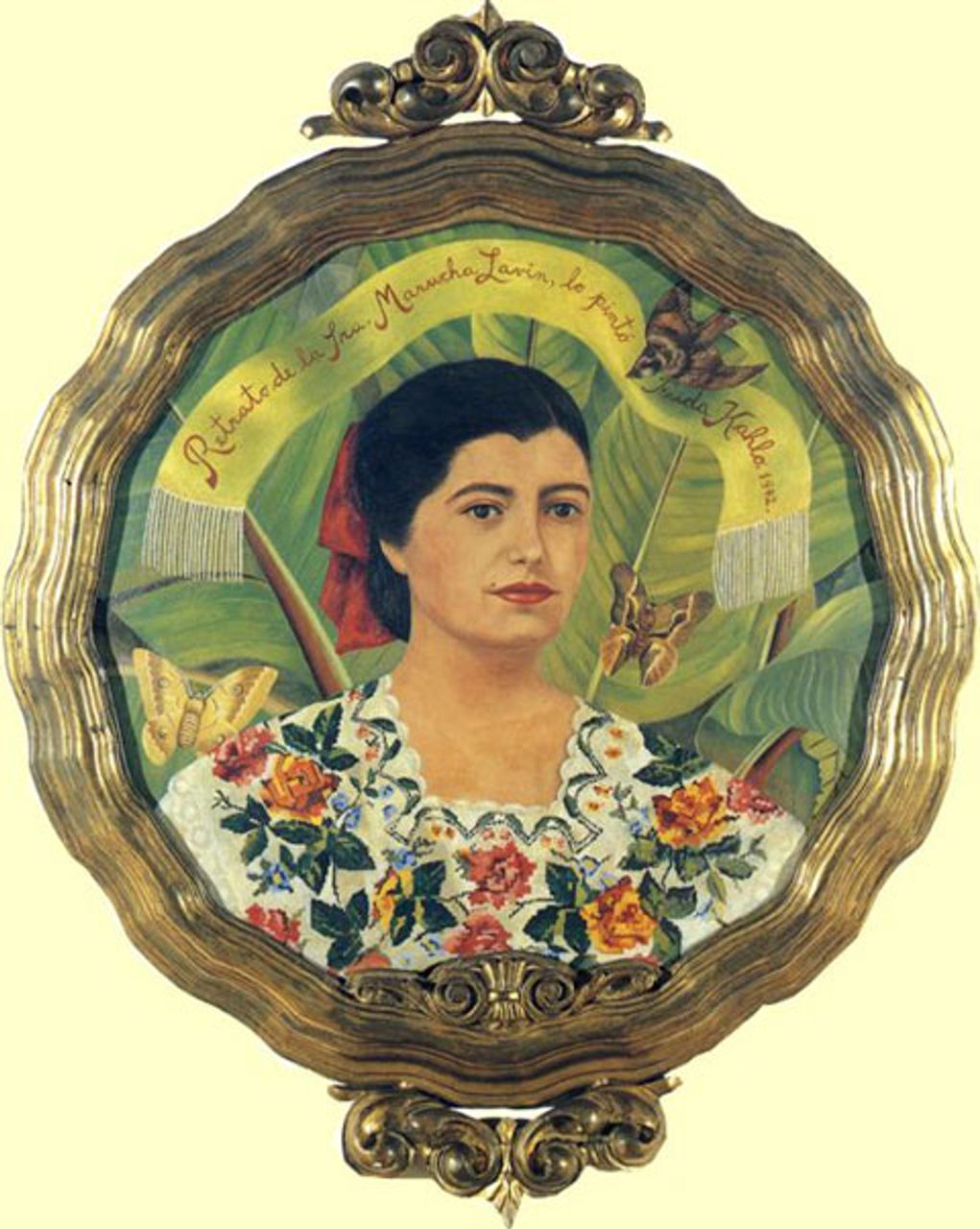 Frida Kahlo, Portrait of Marucha Lavin, 1942. Copyright by“Olga’s Gallery” www.abcgallery.comPortraits, usually women, were enhanced through allusions and symbols that characterize the person portrayed. Revealing, humorous means were used to unmask the person depicted on a second glance, and also to shift the meaning of the seemingly unambiguous depiction. The butterflies surrounding the woman portrayed in the 1942 portrait Marucha Lavín are actually nocturnal moths, in other words, pests—a reference to a well-known Mexican pun: “La Polilla come tela, la mujer te la come”. (“The moth eats the material, but the woman, you!”)