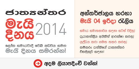 සාඩම්බර බවේ ශාපයට බිලි නොවීම පිනිස අපි මෙම ජයග්‍රහන මත වැතිර නොසිටින්නෙමු. දැවැන්ත අභියෝග අප ඉදිරියේ තිබේ. එහෙත් මාක්ස්වාදීන් හා ඓතිහාසික භෞතිකවාදීන් හැටියට අපි, අපගේ ඉතිහාසයෙහි වෛෂයික වැදගත්කම වටහාගන්නෙමු. කම්කරු පන්තිය සිය පැරනි සංවිධාන බිඳවැටීම පමනක් නොව, 1917 ඔක්තෝබර් විප්ලවයෙන් බිහිවූ කම්කරු රාජ්‍යය විසුරුවා හැරීම ද අත් දකිනු ලැබූ උග්‍ර නායකත්වයේ අර්බුදයක් හමුවේ, විසිවන සියවසේ අත්දැකීම් උකහා ගැනීමත් 21වන සියවසේ විප්ලවවාදී අරගලයන්ට කම්කරු පන්තිය සූදානම් කිරීමත් යන අත්‍යවශ්‍ය ක්‍රියාවලිය එය නියෝජනය කරයි. 2014 මැයි දිනය ජාත්‍යන්තර කමිටුව සමග සමරන ලෙස ලෝකයේ වැඩි දියුනු කම්කරුවන්ට කියා සිටීමේ අයිතිය අප සතුකරගෙන ඇත. මෙය නිමාවකට ගෙන ඒමේදී, ලියොන් ට්‍රොට්ස්කි අපේක්ෂා කල පරිදි සමාජවාදී විප්ලවයේ ලෝක පක්ෂය ගොඩනැඟීමේ නොනස්නාසුලු ක්‍රියාකලාපයක් ඉටු කල, ට්‍රොට්ස්කිවාදය සඳහා දශක ගනනාවක සටන සිය උර මත තබාගෙන ගිය, ඔබගේ ශාඛාවේ නායකත්වයෙහි සියලු සහෝදරවරුන්ට මගේ ප්‍රසාදය හා අසීමිත ප්‍රනාමය පල කිරීමට මම කැමැත්තෙමි.