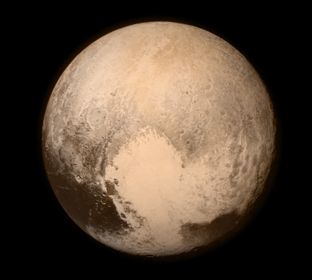 මෙම ඡායාරූපය ගන්නා ලද්දේ 2015 ජූලි 13 දින අභ්‍යවකාශ යානය ප්ලූටෝගේ පෘෂ්ඨයේ සිට කිලෝමීටර 768,000ක් දුරින් තිබිය දී ය. මධ්‍යස්ථ කොටසේ පෙනුම ප්ලූටෝගේ ඉතිහාසයේ භූවිද්‍යාත්මක ක්‍රියාකාරීත්වයේ ප්‍රතිඵලය විය හැක. (ස්තුතිය: නාසා/ජේඑච්යූඒපීඑල්/එස්බඩ්ලිව්ආර්අයි) Credit: NASA/JHUAPL/SwRI
