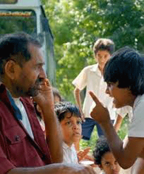 චිත්‍රපටයේ එන ගමේ බස් රියැදුරා හට දරුවන් විසින් මාර්ග සංඥා පාඩම උගන්වමින්