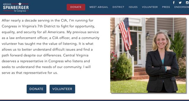 වර්ජිනියාවේ රිච්මන්ඞ්හි උප නගර වල එක දිස්ත්‍රික්කයක ඩිමොක්‍රටික් පාක්ෂික නාමයෝජනා ඉල්ලා සිටින අබිගෙල් ස්පන්බර්ගර් සිය වෙබ් අඩවියේ මුලට මෙසේ ප්‍රකාශ කරයි: “සීඅයිඒ සංවිධානයේ අවුරුදු දහයක් වැඩ කිරීමෙන් පසුව මම, ඇමරිකානුවන් සඳහා අවස්ථාව, සමානත්වය සහ ආරක්ෂාව උදෙසා සටන් කිරීමට වර්ජිනියාවේ 7වන දිස්ත්‍රික්කයෙන් කොන්ග්‍රසය සඳහා තරග වදිමි. නීතිය ක්‍රියාත්මක කිරීමේ නිලධාරියෙකු, සීඅයි ඒ නිලධාරියෙකු සහ ස්වේච්ඡා ප්‍රජා සේවකයෙකු හැටියට මා කලින් ඉටු කර තිබෙන සේවාව ඇහුම්කන් දීමේ වටිනාකම මට උගන්වා තිබේ.” ඇත්තට ම !