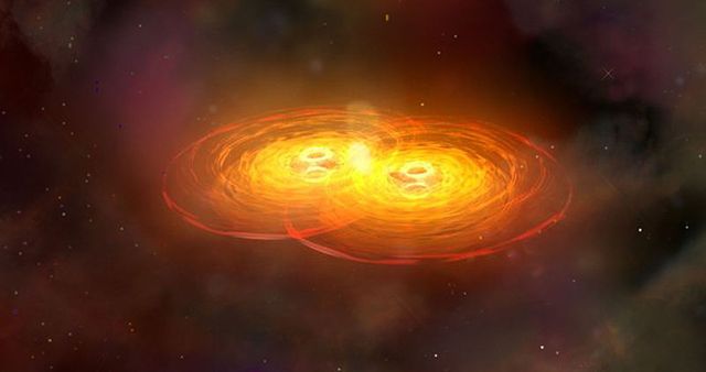 කලු කුහර දෙකක් බද්ධ වන ආකාරය පිලිබඳ චිත්‍රශිල්පියෙකුගේ නිරූපනය (ස්තුතිය: නාසා/සීඑක්ස්සී/ ඒ. හොබාට්) [Credit: NASA/CXC/A.Hobart]
