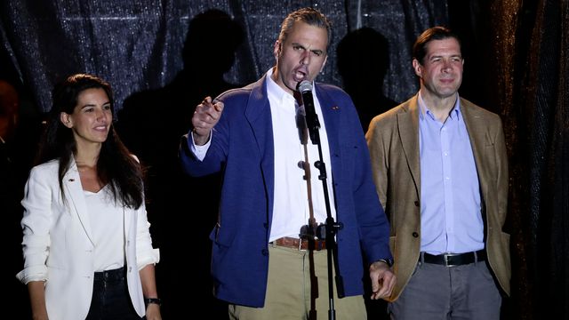 2019 අප්‍රේල් 28 ඉරිදා මැඞ්රිඞ්හි දී මහ මැතිවරනයේ ප්‍රතිඵල අපේක්ෂාවෙන් සිටිමින් වොක්ස් පක්ෂයේ මූලස්ථානයෙන් පිටත රැස්ව සිටින ආධාරකරුවන් අමතන පක්ෂ මහ ලේකම් හාවියර් ඔටේගා ස්මිත් (ඒපී ඡායාරූපය-මැනූ ෆර්නැන්ඩෙස්) (AP Photo - Manu Fernandez)