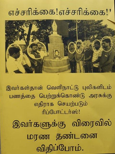 පත්‍රිකාව මෙසේ ප්‍රකාශ කලේ ය: “මොවුන් ආන්ඩුවට විරුද්ධ ප්‍රවෘත්ති පලකරන විදේශීය-කොටින්ගේ අරමුදල් ලබන අය යි. වැඩිකල් නො යා අපි ඔවුන්ට මරන දඬුවම දෙන්නෙමු.”