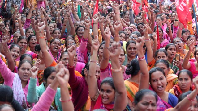2020 ජනවාරි 8 වන බදාදා ඉන්දියාවේ අහමදාබාද්හි පැවති මහා වැඩ වර්ජනය අතරතුර කම්කරුවෝ සටන් පාඨ හඬ නගති (ඒපී ඡායාරූපය / අජිත් සොලංකි)